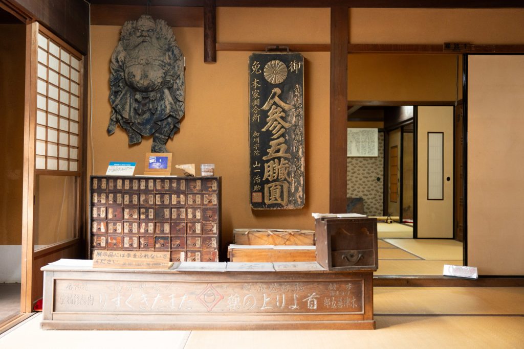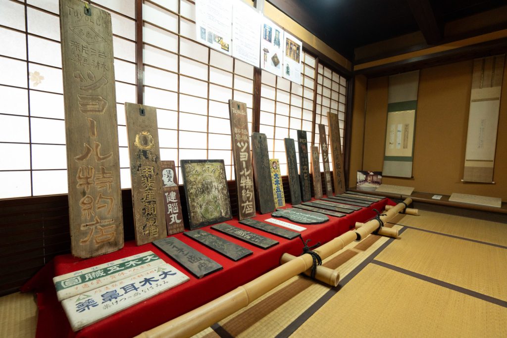 館内に展示された帳場や往時の看板。薬棚の上に鍾馗※が掛けられている。