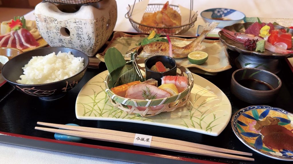 初日のランチは宇陀松山、今阪屋の会席料理(ランチコース)。旬の食材を活かした美しい盛り付けが目にも楽しい。前菜からデザートまで、ひとつひとつ丁寧に作られており、口に入れるたびに季節の香りや味わいが広がる。