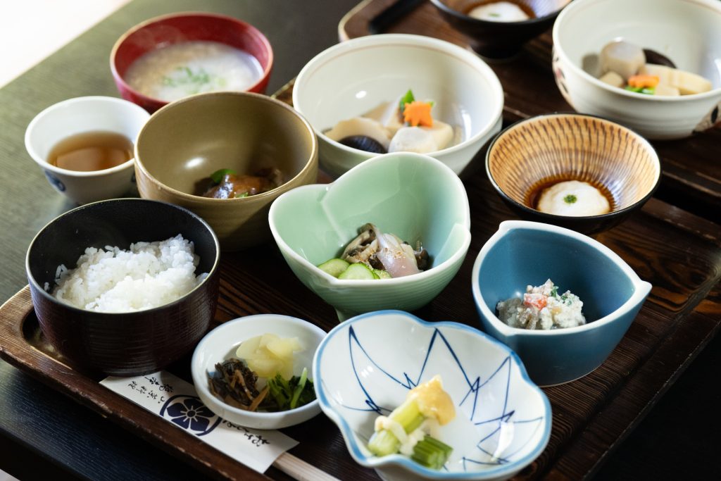 二日目は、室生寺門前の料理旅館橋本屋の山菜定食(あじさい)。地元の山菜などを使用した、身体にじんわりと染み入る繊細な味付けの料理だ。名物のとろろ汁は絶品。室生川の美しい流れや太鼓橋を眺めながらいただく。