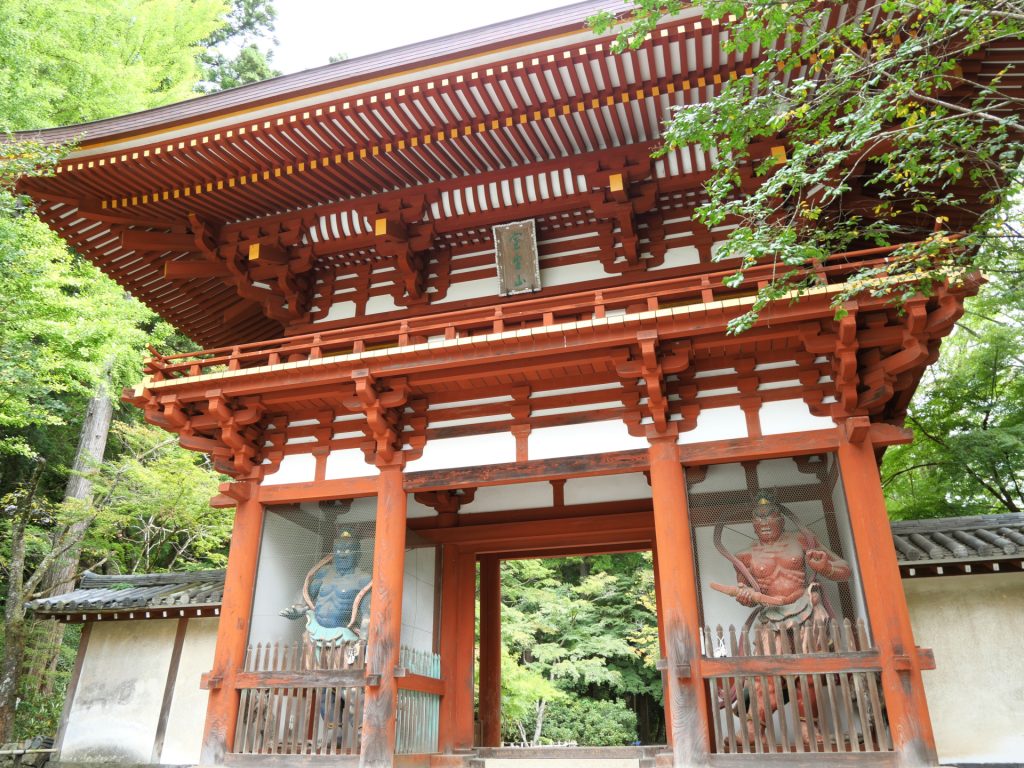 写真は順に、①平安時代初期に建立された金堂(国宝)。手前に見える高床は礼拝のため江戸時代に増築された。②仁王門。仏敵が寺院内に入ることを防ぐ守護神