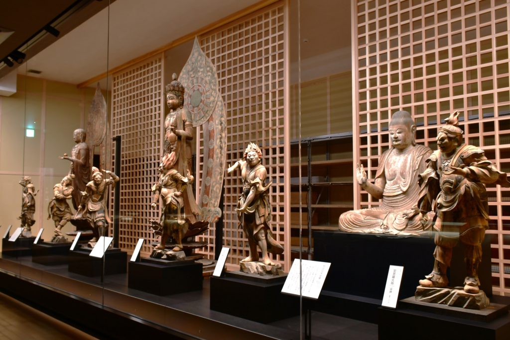 令和二年(2020年)に竣工した寶物殿には9体の仏像と密教仏具などが展示されている。写真の中央奥は女性的な優しさを感じる十一面観音菩薩立像(平安時代初期、国宝)。右手奥は穏やかな表情が美しい釈迦如来坐像(平安時代初期、国宝)。手前の6体は薬師如来の従者として12の方位を守る十二神将立像。寅神、卯神、辰神、巳神、未神、酉神(鎌倉時代、重要文化財)が安置されている。