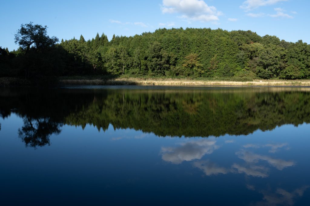 まるで鏡のように周囲の木々を映し出す神秘的な池。風のない日には、水面に空と森がくっきりと映り込み、まるで上下がひとつになったような幻想的な景色が広がる。